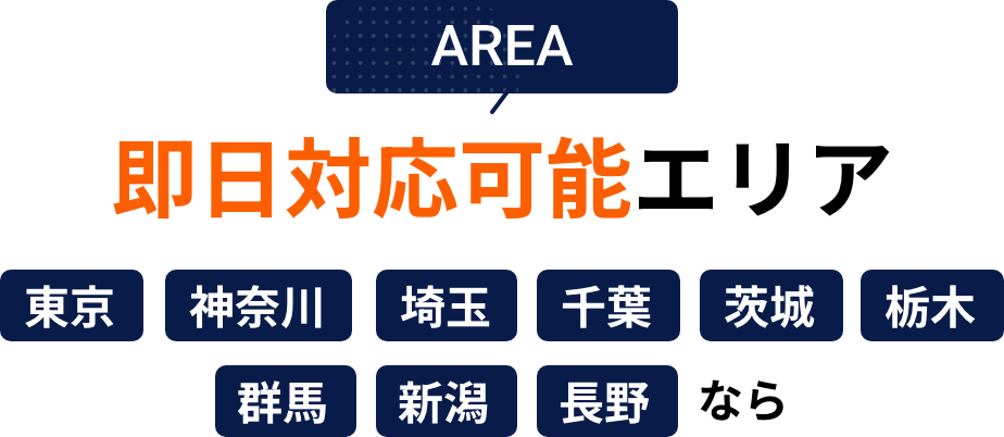 対応エリアの東京都、埼玉県、神奈川県、千葉県、茨城県、栃木県、群馬県であれば即日対応可能です。深夜や土日も対応可能ですので、まずはお問い合わせ下さい。