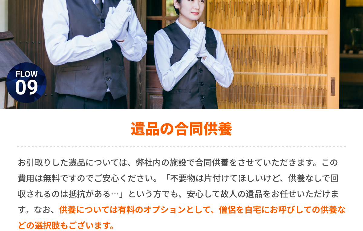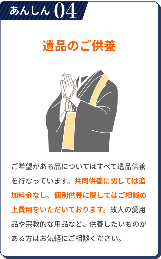 弊社内の施設での合同供養は無料となります。追加料金にはなりますが、僧侶を自宅にお呼びしての供養も可能です。