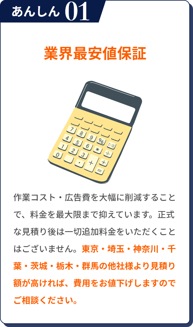 ご安心下さい!安さの秘訣は効率化にあります。他社よりも優れたサービスで、お安い価格を実現しております。